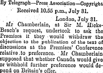 By Telegraph—Press Association—Copyright Received 10.55 p.m., July 31. LondoD, July 31. Mr Chamberlain, at Sir M. HicksBeack’s request, undertook to ask tho Premiers it they would withdraw the objection to the publication of the text of discussions at the Premiers’ Conference rolative ,to preference. Mr Chamberlain supposed that whether Canada would give or withhold further preference would depend on Britain's offer.