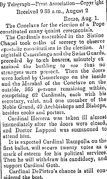 By Teleeraph—Press Association —Copyr igbt Received 9.33 a m., August 2 Romo, Aug. 1. The Conclave for the election of a Pope constituted many quaint ceremonials. The Cardinals assembled in the Sisi-iao Chapel took oaths oi secrecy to observe apostolic constitutions in the election. At nightfall Caiuerlengo and the Swiss Guards, preceded by torch bearers, minutely ex amined the building to see that no strangers were present. Then too doors were locked by Camerlcngo on the inside and the Marshal of the Conclave on toe outside, 365 persons remaining within, comprising 62 Cardinals, each with bis secretary, valet, and one member of the Noble Grand, 40 Archbishops and Bishops, besides cooks and porters. Cardinal Herrera was takon ill almost immediately after the doors woro closed, and Doctor Lapponi was summoned to attend him. It is expected Cardinal Rampojla on the first ballot, will secure twenty votes as a mark of esteem for bia political services. Then ho will withdraw his candidacy, and support Cardinal Gotb. Cardinal DePietro’s chanco is still considered the best.