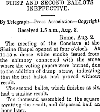 FIRST AND SECOND BALLOTS INEFFECTIVE. By Telegraph—Press Association —Copyright Received 1.5 a.m., Aug. 3. Rome, Aug. 2. The mooting of the Conclave at tho Sistine Chapel opened at four o’clock. At 11.15 a dense white smoko issuod from the chimney connected with the stove where the voting papers were burned, due to the addition of damp straw, indicating that the first ballot had proved without result. Tho second ballot, which finishes at six, had a similar result. Ten thousand assembled in the square, awaiting the result, and dispersed half an hour later.