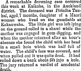 A remarkable drowning case occurred this week at Kaikohe, in the Auckland district. The deceased was Piriniha Tauhai, aggd.7 months, daughter of a Maori woman who lived on the gumfields at Kakauwaha. The little girl was left lying on the ground rolled in a shawl while the mother was engaged in gum-digging, and when the mother returned after an hour’s absence she found the child with her head in a small hole which was half full of water. The child’s face was covered, and when pulled out it vyas quite dead. It had rolled down a bank about fift jnt-o a hole. Tho jury returned a verdict of accidental death.