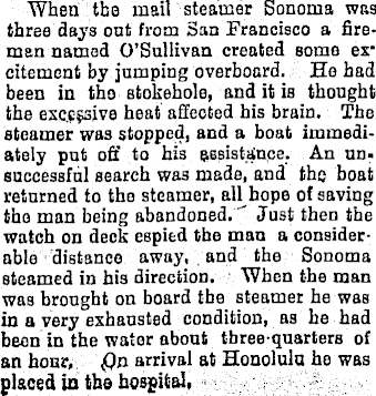 When the mail steamer Sonoma was three days out from San Francisco a fireman named O’Sullivan created some ex’ citement by jumping overboard. He had been in tho stokehole, and it is thought the excessive heat affected his brain. The steamer was stopped, and a boat immediately put off to his assistance. An unsuccessful search was made, and the boat returned to tho steamer, all hope of saving tho man being abandoned. Just then the watch on deck espied the man a considerable distance away, and the Sonoma steamed in his direction. When the man was brought on board the steamer he was in a very exhausted condition, as he had been in the water about three-quarters of an honr, Qu arrival at Honolulu he was placed in the hospital.