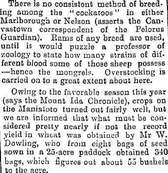 There is do consistent method of breeding among the “ cockatoos ” in either Marlborough or Nelson (asserts the Canvastown correspondent of the Pelorus Guardian). Earns of any breed are used, until it would puzzle a professor of zoology to state how many strains of different blood some of those sheep possess I —hence the mongrels. Overstocking is carried on to a great extent about here. Owing to the favorable season this year (says the Mount Ida Chronicle), crops on the Maniatoto turned out fairly well, but we are informed that what must be considered pretty nearly if uot tho record yield in wheat was obtained by Mr W. Dowling, who from eight bags of seed sown in a 25-acre paddock obtained 840 bags, which figures out about uo bushels to the acre.