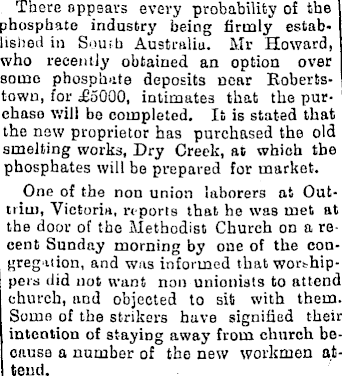 There appears every probability of the phosphate industry being firmly established in South Australia. Mr Howard, who recently obtained an option over some phosphate deposits near Robertstown, for £SOOO, intimates that the purchase will be completed. It is stated that the new proprietor has purchased the old smelting works, Dry Creek, at which the phosphates will be prepared for market. One of the non union laborers at Outtrini, Victoria, reports that ho was met at the door of the Methodist Church on a recent Sunday morning by one of the congregation, and was informed that won-hip-pers did not want non unionists to attend church, and objected to sit with them. Some of the strikers have signified their intention of staying away from church because a number of the new workmen attend.