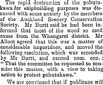 The rapid destruction of tho pohutukawa for shipbuilding purposes was discussed with some anxiety by the members of tho Auckland Scenery Conservation Society. Mr Burtt said he had been informed that most of the wood so used came from the Whangarei district. Mr Allom agreed that this was a matter of considerable importance, and moved the following resolution, which was seconded by Mr Burtt, and earned nem. con.: “ That the committee be requested to consider this matter, with a view to taking [ action to protect pohutukawa.” We are convinced that if publicans will
