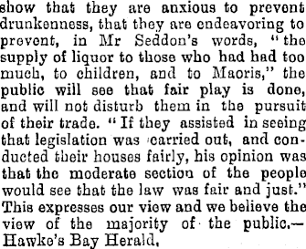 show that they are anxious to prevent drunkenness, that they are endeavoring to prevent, in Mr Seddon’s words, “ the supply of liquor to those who had had too much, to children, and to Maoris,” the public will see that fair play is done, and will not disturb them in the pursuit of their trade. “ If they assisted in seeing that legislation was carried out, and conducted their houses fairly, his opinion was that the moderate section of the people would see that the law was fair and just.” This expresses our view and we believe the view of the majority of the public.— Hawke’s Bay Herald,