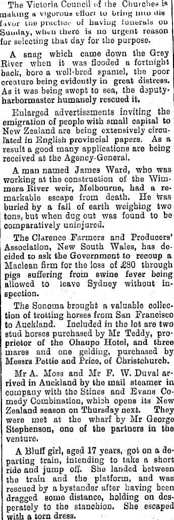 The Victoria Council of ihe Churches is 1 making a vigorous efiorr to bring lino ilis favor me practice of having luuerals on Sunday, when there is no urgent reason for selecting that day for tho purpose. A snag which came down the Grey River when it was flooded a fortnight back, boro a well-bred spaniel, the poor creaturo being evidently in great distress. As it was being swept to sea, the deputyharbormaster humanely rescued it. Enlarged advertisements inviting the emigration of people with small capital to New Zealand are being extensively circulated in English provincial papers. As a result a good many applications are being received at tbe Agency-General. A man named James Ward, who was working at the construction of the Wimmera River weir, Melbourne, had a remarkable escape from death. He was | buried by a fall of earth weighing two tons, but when dug out was found to be comparatively uninjured. The Clarence Farmers and Producers’ Association, New South Wales, has decided to ask tho Government to recoup a Maclean firm for tho loss of 1180 through pigs suffering from swine fever being allowed to leave Sydney without inspection. The Sonoma brought a valuable collection of trotting horses from San Francisco to Auckland. Included in the lot are two stud horses purchased by Mr Teddy, proprietor of tho Ohaupo Hotel, and three mares and one gelding, purchased by Messrs Pettie and Price, of Christchurch. Mr A. Moss and Mr F. W. Duval arrived in Auckland by the mail steamer in company with tho Stines and Evans Comedy Combination, which opens its New Zealand season on Thursday next. They were met at the wharf by Mr George Stephenson, one of the partners in the venture, A Bluff girl, aged 17 years, got on a departing train, intending to take a short ride and jump off. She landed between the train and the platform, and was rescued by a bystandor after having been dragged some distance, holdiug on desperately to tho stanchion. She escaped with a torn dress.