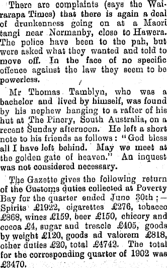 There are complaints (says the Wairarapa Times) that there is again a deal of drunkenness going on at a Maori tangi near Normanby, close to Hawera. The police have beon to the pah, but were asked what they wanted and told to move off. In the face of no specific offence against the law they seem to be powerless. / Mr Thomas Tamblyn, who was a bachelor and lived by himself, was found by bis nephew hanging to a rafter of his hut at The Pinery, South Australia, on a recent Sunday afternoon. He left a short note to his friends as follows : “ God bless all I have loft behind. May we meet at the golden gate of heaven.” An inquest was not considered necessary. The Gazette gives the following return of the Customs duties collected at Poverty Bay for the quarter ended Juno 30th : Spirits £1922, cigarettes £276, tohaoeo £B6B, wines £159, beer £l5O, chicory and cocoa £4, sugar and treacle £405, goods by weight £l2O, goods ad valorem £BIB, other duties £2O, total £4742. The total for the corresponding quarter of 1902 was £3470.
