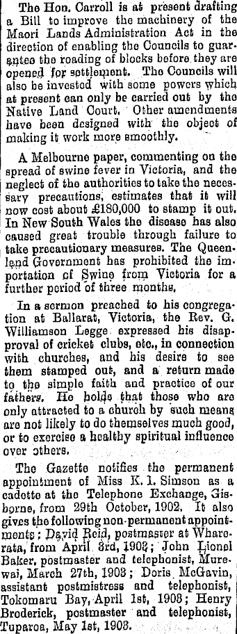 The Hon. Carroll is at present drafting a Bill to improve the machinery of the Maori Lands Administration Act in the direction of enabling the Councils to guars9teo the roading of blocks before they are opened for settlement. The Councils will also be invested with some powers which at present can only be carried out by the Native Land Court. Other amendments have been designed with the object of making it work more smoothly. A Melbourne paper, commenting on the spread of swine fever in Victoria, and the neglect of the authorities to take the necessary precautions, estimates that it will now cost about £IBO,OOO to stamp it out. In New South Wales the disease has also caused great trouble through failure to take precautionary measures. The Queen4nd Government has prohibited the importation of Swine from Victoria for a further period of three months, In a sermon preached to his congregation at Ballarat, Victoria, the Eev. G. Williamson Legge expressed his disapproval of cricket clubs, otc., in connection with churches, and his desire to see them stamped out, and a return made to the simple faith and practice of our fathers. He holds that those who are only attracted to a church by such means are not likely to do themselves much good, or to exerciso a healthy spiritual influence over others, The Gazette notifies the permanent appointment of Miss K. 1. Simson as a cadotte at the Telephone Exchange, Gisborne, from 29th October, 1902. It also gives the following non-permanent appointments ; Day id Reid, postmaster at Wharerata, from April 3rd, 1903; John Lionel Baker, postmaster and telephonist, Murewai, March 27th, 1903 ; Doris McGavin, assistant postmistress and telephonist, Tokomaru Bay, April Ist, 1903; Henry Broderick, postmaster and telephonist, Tuparoa, May Ist, 1903.