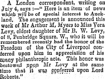A London correspondent, writing on July 4, says :—“ Here is an item of news whLb wil) be of special interest to Auckland, The engagement is announced this week of Mr Arthur M, Myers to Miss Vera Levy, oldest daughter of Mr B, W. Levy, of 8, Penbridge Square, W., who it will be remembered recently had the honor of the Freedom of the City of Liverpool conferred upon him in appreciation of his n?apy philanthropic acts. This honor was bestowed upon Mr Levy at the same time that' it ‘ wq? inferred upon Lord Roberts.”