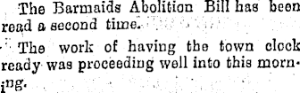 The Barmaids Abolition Bill has been read o second time. The work of having the town clock ready was proceeding well into this morning-