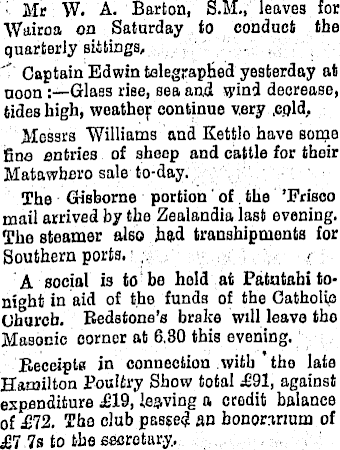 Mr W. A. Barton, S.M., leaves for Wairoa on Saturday to conduct the quarterly sittings, Captain Edwin telegraphed yesterday at noon Glass rise, sea and wind decrease, tides high, weather continue v.ery ,cold. Messrs Williams and Kettle have some fine entries of sheep and cattle for their Matawbero sale to-day. The Gisborne portion of. the ’Frisoo mail arrived by the Zealandia last evening. The steamer also had transhipments for Southern ports. A social is to be held at Patutahi tonight in aid of the funds of the Catholic Church. Redstone’s brake will leave the Masonic corner at 6.30 this evening. Receipts in connection with the late Hamilton Poultry Show total £9l, against expenditure £l9, leaving a credit balance of £72. The club passed an honorarium of £7 7s to the secretary.