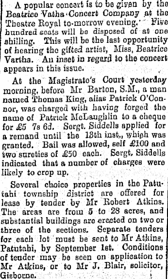 A popular concert is to be given by the Beatrice Vatha'Concert Company at the Theatre Royal to-morrow evening,’ Five hundred seats will be disposed of at one shilling. This will be the last opportunity of hearing the gifted artist, Miss, Beatrice Vartha. An inset in regard to the concert appears in this issue. At the Magistrate's Court yesterday morning, before Mr Barton, S.M., a man named Thomas King, alias Patrick O’Connor, was charged with having forged the name of Patrick McLaughlin to a cheque for £5 7s 6d. Sorgt. Siddells applied for a remand until the 13th inst. M which was granted. Bail was allowed, self £IOO and two sureties of £SO each. Sergt, Siddells indicated that a number of charges were likely to crop up. Several choice properties in tho Patutahi township district are offered for lease by tender by Mr Robert Atkins. The areas are from 5 to 28 acres, and substantial buildings aro erected on two or threo of the sections. Separate tenders for each lot must he sent to Mr Atkins, Patutahi, by September Ist. Conditions of tender may be seen on application to Mr Atkins, or to Mr J. Blair, solicitor, Gisborne. i
