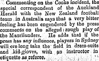 Commenting on the Cooke incident, the special correspondent of the Auckland Herald with the Now Zealand football team in Australia says that a very bitter feeling has been engendered by the press comments on the alleged i rough play of the Maorilanders. He adds that if the press has any influence, players in Sy.dDey will ere long take the field in dress-suits and kid-gloves, with an instructor in etiquette as referee.