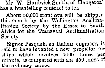 Mr W. Hardwick Smith, of Hangaroa < has a bushfelling contract to let. About 50,000 trout ova will be shipped this month by the Wellington Acclimatisation Society by the Essex to South Africa for the Transvaal Acclimatisation Society. Signor Pasquali, an Italian engineer, is said to have invented a now propellor for ships which revolves 1000 times per minute, as compared with the 450 times of the ordinary screw.