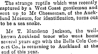 The strange reptile which was recently captured by a West Coast gentleman and sent up to Mr Cheeseman, of the Auckland Museum, for identification, turns out to be a sea snake. Mr T. Mandeno Jackson, the wellknown Auckland tenor wbo went borne several years ago with the Bello Cole Concert Co., is returning to Auckland at the end of this year.