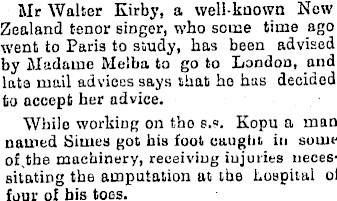 Mr Walter Kirby, a well-known New Zealand tenor singer, who some time ago went to Paris to study, has been advised by Madame Melba to go to London, and late mail advices says that ho has decided to accept her advice. While working on tho s.=. Kopu a man named Simes got bis foot caught in some of,the machinery, receiving injuries necessitating the amputation at the hospital of four of his toc-s.