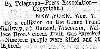 By; Telegraph—Press AssociationCopyright.) NEW YORK, Aug. 7. By a collision on the Grand Trunk Railway, at Durand, Wisconsin, Wallace Bros. 4 , circus train was Wrecked Nineteen .people were killed and 30 injured.-
