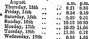 August. a.m. p.m. Thursday, 13th .. .. 8.21 8.36 Friday, 14th .. 8.54 9.10 ’’ Saturday, 16th .. .. 9.29 9.51 Sunday, 16th „ 10.13 10.30 Monday, 17th .. .. 10.39 11.OG Tuesday, 18th ,, 11.36 0.12 Wednesday, 19 th .. 0.63 1.35