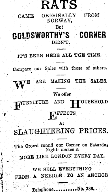 RATS CAME ORIGINALLY FROM NORWAY, But GOLDSWORTHY’S CORNER DIDN’T. IT’S BEEN HERE ALL THE TIME. Compare our Sales with those of others. ARE MAKING THE SALES. We offer FURNITURE AND JJOUBEHOLD f'jIFFECTS F E 1 At SLAUGHTERING PRICES. The Crowd round our Corner on Saturday Nights makes it ' more LIKE LONDON EVERY DAY. WE SELL EVERYTHING j FROM A NEEDLE TO AN ANCHOR. Telephone .No. 233.