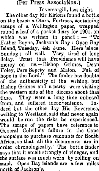 (Per Press Association.) Invercargill, last night. The other day Mr Kirkers found a bottle on tho beach a Otara, Fortrose, containing scraps of a Wellington paper, wrapped round a leaf of a pocket diary for 1901, on which was written in pencil : “To Father Boyne, Jackson’s Bay: Open Bay Island, Tuesday, 4th June. Here Vsince Sunday; all well. Very tired of long delay. Trust that Providence will have mercy on us.—Bishop Grimes, Dean Foley, Pere Sepety and Malon. Full of hope in the Lord.” The finder has doubts of the authenticity of tho writing, but Bishop Grimes and a party were visiting the western side of the diocese about that time. They - wero a long time unheard from, and suffered inconvenience. Indoed but tho other day His Reverence, writing to Westland, said that never again would ho run the risks he experienced. Tho scraps of papers have reference to General Colville’s failure in tho Cape campaign to purchase remounts for South Africa, so that all tho documents are in order chronologically. The bottle fiuder says that it smelt strongly of vinegar, and the surface was much worn by rolling on sand. Open Bay islands are a few miles north of Jackson’s.