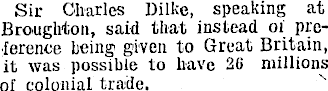 Sir Charles Dilke, speaking at Broughton, said that instead of preference being given to Great Britain, it was possible to have 26 millions ol colonial trade.