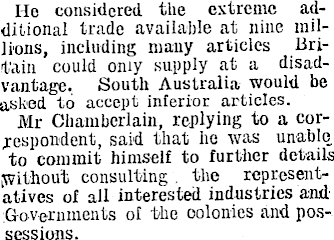 He considered the extreme additional trade available at nine millions, including many articles Britain could only supply at a disadvantage. South Australia would be asked to accept interior articles. Mr Chamberlain, replying to a correspondent, said that he was unable to commit himself to further details [Without consulting the representatives of all interested industries and Governments of the colonies and possessions.