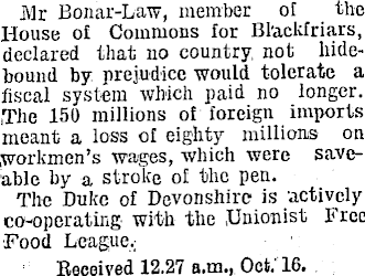 Mr Bonar-Law, member of the House of Commons for Bhackfriars, declared that no country not hidebound by prejudice would tolerate a fiscal system which paid no longer. The 150 millions of foreign imports meant a loss of eighty millions on .workmen’s wages, which were saveable by a stroke of the pen. The Duke of Devonshire is actively co-operating with the Unionist Free Food League. Received 12.27 a.m., Oct. 16.