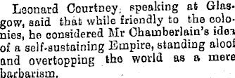 Leonard Courtney, speaking at Glasgow) said that while friendly to the colonies, he considered Mr Chamberlain s idea of a self-sustaining Empire, standing aloof and overtopping the world as a mere barbarism