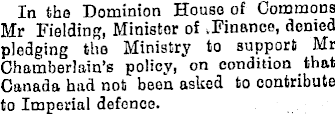 In the Dominion House of Commons Mr Fielding, Minister of .Finance, denied pledging the Ministry to support Mr Chamberlain’s policy, on condition that Canada had not boon asked to contribute to Imperial defence.