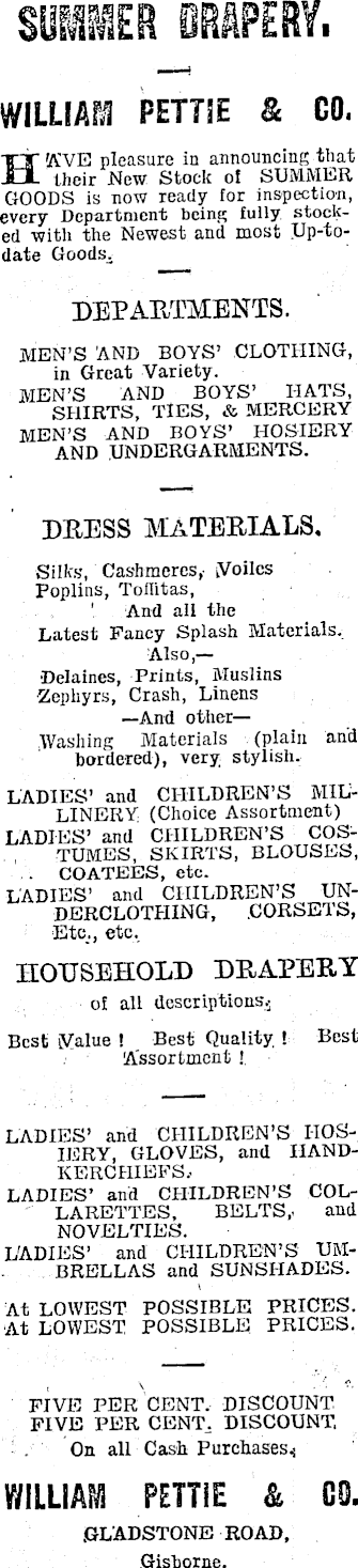 WILLIAM PETTSE & CO. HAVE pleasure in announcing that their New Stock ol SUMMER GOODS is now ready for inspection, every Department being fully stocked with the Newest and most Up-to-date Goods. DEPARTMENTS. MEN’S AND BOYS’ CLOTHING, in Great Variety. MEN’S AND BOYS’ HATS, SHIRTS, TIES, & MERCERY MEN’S AND BOYS’ HOSIERY AND UNDERGARMENTS. DRESS MATERIALS, Silks, Cashmeres, Voiles Poplins, Toflitas, 1 And all the Latest Fancy Splash Materials. Also,— Delaines, Prints, Muslins Zephyrs, Crash, Linens —And otherWashing Materials (plain and bordered), very stylish. LADIES’ and CHILDREN’S MILLINERY (Choice Assortment) LADIES’ and CHILDREN’S COSTUMES, SKIRTS, BLOUSES, COATEES, etc. LADIES’ and CHILDREN’S UNDERCLOTHING, CORSETS, Etc., etc. HOUSEHOLD DRAPERY of all descriptions.; Best Value ! Best Quality. ! Best Assortment ! LADIES’ and CHILDREN’S HOSIERY, GLOVES, and HANDKERCHIEFS.. LADIES’ and CHILDREN’S COLLARETTES, BELTS,. and NOVELTIES. LADIES’ and CHILDREN’S UMBRELLAS and SUNSHADES. At LOWEST POSSIBLE PRICES. At LOWEST POSSIBLE PRICES. FIVE PER CENT. DISCOUNT FIVE PER CENT. DISCOUNT. On all Cash Purchases.; WILLIAM PETTIE & 00. .GLADSTONE ROAD, Gisborne.
