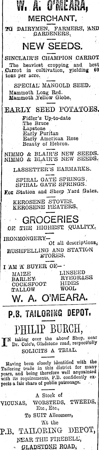 W. A, O’IEARA, MERCHANT. TQ DAIRYMEN, FARMERS, AND .GARDENERS, NEW SEEDS. SINCLAIR’S CHAMPION CARROT The heaviest cropping and best .Carrot in cultivation, yielding 60 tons per acre. SPECIAL' MANGOLD. SEED, Mammoth Long Red. Mammoth .Yellow Globe, EARLY SEED POTATOES. Fidler’s Up-to-date The Bruce Lapstone . Early Puritan Early American Rose Beauty of Hebron. NIMMO & BLAIR’S NEW SEEDS. NIMMO & BLAIR’S NEW SEEDS. LASSETTER’S EARMARKS. SPIRAL GATE SPRINGS. SPIRAL GATE SPRINGS. F.ox Station and Sheep .Yard Gates. KEROSENE STOVES. KEROSENE HEATERS, GROCERIES OE THE HIGHEST, QUALITY*. IRONMONGERY- . . 01 all descriptions^ RUSHFELLING AND STATION STORES. I AM A BUYER OE- * MAIZE BARLEY. COCKSFOOT TALLOW LINSEED RYEGRASS HIDES WOOL W. A. O’MEARA. P.B. TAILORING DEPOT. ImiPBURCH, r taking over tho abovo’ Shop, near Dr. Colo’s, Gladstone road, respectfully SOLICITS A TRIAL. Having been closely identified with tho Tailoring trade in this district for many years, and being therefore well acquainted with its requirements, P.B. confidently expects a fair share of publics patronage. A Stock of VICUNAS, "WORSTEDS, TWEEDS, Etc., Etc,, To SUIT Allcomers, 'At the P.B. TAILORING DEPOT, NEAR THE FIREBELL', ■■ GLADSTONE ROAD,