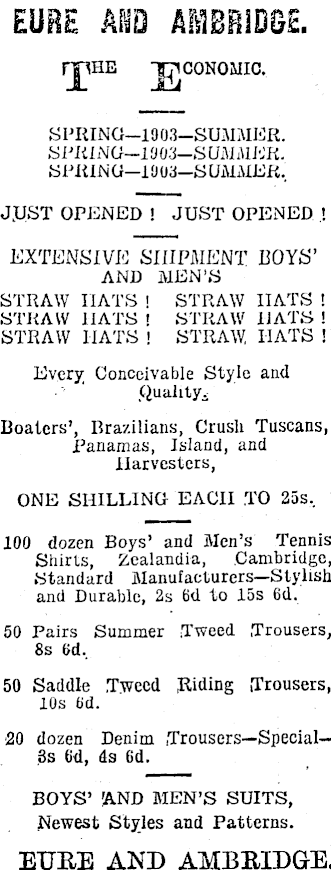 rjpiE T7ICONOMIC, SPRING—IOO3—SUMMER. SPRING—I9O3—SUMMER. SPRING—I 9 03 —S UjUMEK, JUST OPENED ! JUST OPENED ! EXTENSIVE SHIPMENT ROYS’ AND MEN’S STRAW lIATS ! STRAW lIATS ! STRAW HATS ! STRAW HATS ! STRAW lIATS ! STRAW, lIATS ! Every; Conceivable Style and Quality. Boaters’, Brazilians, Crusli Tuscans, Panamas, Island, and Harvesters, ONE SHILLING EACH TO 255, 100 dozen Boys’ and Men’s Tennis Shirts, Zealandia, Cambridge, Standard Manufacturers—Stylish and Durable, 2s 6d to 15s 6d. 50 Pairs Summer Tweed .Trousers, 8s (id, 50 Saddle .Tweed Riding Trousers, 10s (id. 20 dozen Denim .Trousers—Special—--3s 6d, ds 6‘d. BOYS’ 'AND MEN’S SUITS, Newest Styles and Patterns. EURE AND AMBRIDGE.