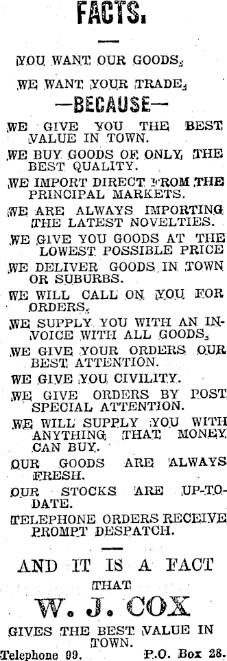 I IY.OU WANT OUR GOODS, WE WANT, YOUR .TRADER —B£QAyS£— WE GIVE YOU THE BEST VALUE IN TOWN. .WE BUY GOODS OF. ONLY THE BEST QUALITY. WE IMPORT DIRECT. FROM .THE PRINCIPAL MARKETS. WE ARE ALWAYS IMPORTING ,TIIE LATEST NOVELTIES. WE GIVE YOU GOODS AT THE LOWEST POSSIBLE PRICE WE DELIVER GOODS IN .TOWN OR SUBURBS. WE WILL CALL ON, YOU FOR .ORDERS.,. WE SUPPLY YOU WITH AN INVOICE WITH ALL GOODS,, WE GIVE YOUR ORDERS OUR BEST ATTENTION. WE GIVE YOU CIVILITY. WE GIVE ORDERS BY POST, SPECIAL ATTENTION. WE WILL SUPPLY YOU WITH ANYTHING THAT MONEY CAN BUY. OUR GOODS ARE ALWAYS FRESH. OUR STOCKS ARE JJP-T.O- ---‘ DATE. TELEPHONE ORDERS RECEIVE PROMPT’ DESPATCH. AND IT IS A TACT .THAT W. J. COX GIVES THE BEST. VALUE IN TOWN. Telephone 09. P.O. Box 28.