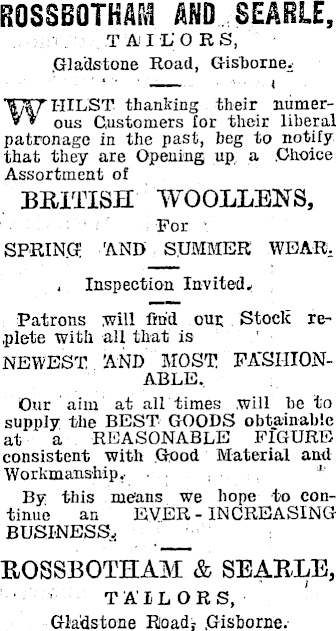 RQSSBOTHMI AND SEARIE, T A I’L'OR S, .Gladstone Road, Gisborne.WHILST thanking their numerous Customers lor their liberal patronage in the past, beg to notify that they are Opening up a Choice Assortment of BRITISH WOOLLENS, For SPRING AND SUMMER WEAR. Inspection Invited, Patrons will find our Stock replete with all that is NEWEST AND MOST FA'SHIONABLE. Our aim at all times will be to supply the BEST GOODS obtainable at a REASONABLE FIGURE consistent with Good Material and Workmanship.. By this means we hope to continue an EVER-INCREASING BUSINESS, ROSSBOTHAM & SEARLE, TAILORS, Gladstone Road, .Gisborne.