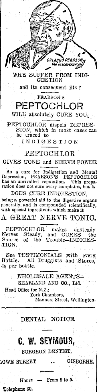 stn; wm) OUIfIHOU PEHffSm/f V)* Uiia&txet*oj WHY, SUFFER FROM INDIGESTION and its consequent ills ? PEARSON’S PEPTOGHLOR WILL' absolutely CURE YOU, PEPTOGHLOR dispels DEPRESSION, which in most cases can bo traced to INDIGESTION PEPTOGHLOR GIVES TONE and NERVE POWER As a euro for Indigestion and Mental Depression, PEARSON’S PEPTOCHLOB has an unrivalled reputation. This preparation does not cure every complaint, but it DOES .CURE INDIGESTION, .being a powerful aid to the digestive organs generally, and is compounded scientifically, with special ingredients which make it A GREAT NERVE TONIC. PEPTOCHLOR makes unsteady Nerves Steady, and CURES the Source of the TroubIe—INDIGESTION. See TESTIMONIALS with every Bottle. All Druggists and Stores, 4s per bottle. WHOLESALE BHARLAND AND CO., Ltd. Head Oflioo for N.Z.: York Chambers, Manners Street, Wellington. DENTAL NOTICE. G. W. SEYMOUR, SURGEON DENTIST, LOWE STREET .. GISBORNE. Hour 3 Telephone 30. From 9 to 5.