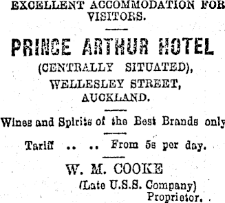EXCELLENT ACCOMMODATION BOR VISITORS. PRINCE ARTHUR HOTEL (CENTRALLY SITUATED), WELLESLEY STBEET, AUCKLAND. Wines and Spirits ol the Best Brands only, Tariff .. .. From 6s per day. W. M. COOKS ILate U.S.S. Company) Proprietor, .