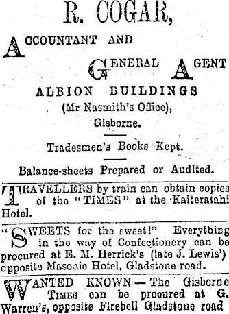 R. COGAR, A' CCOUNTANT AND G ENERAL ALBION BUILDINGS (Mr Nasmith’s Office), Gisborne. Tradesmen’s Books Kept. Balance-sheets Prepared or Audited. TRAVELLERS by train can obtain copies of tho “TIMES” at the Kaiteratahi Hotel. S~" WEETS for the sweet 1” Everything in the way of Confectionery can be procured at E. M. Herrick’s (late J. Lewis’) opposite Masonic Hotel, Gladstone road, ANTED KNOWN The Gisborne Times oan be procured at G, Warrca’fli opposite Fireball Gladstone road