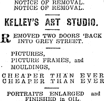 NOTICE OF REMOVAL. NOTICE OF REMOVAL. KELLEY’S MT STOOIO. KEMOVED TWO DOORS ‘BACK INTO GREY STREET. PICTURES, PICTURE FRAMES, and MOULDINGS, CHEAPER THAN EVER CHEAPER THAN EVER PORTRAITS ENLARGED and FINISHED in OIL-