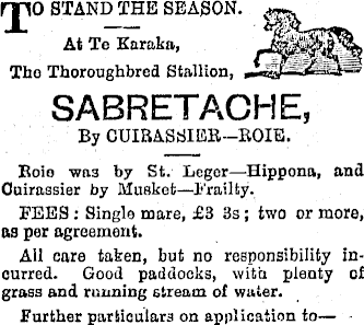 rj7o STAND THE SEASON. At Te Karaka, Tho Thoroughbred Stallion, SABRETACHE, By CUIRASSIER—KOIE. Boie wa3 by St. Leger—Hippona, and Cuirassier by Musket—Frailty. FEES : Single mare, £3 3s; two or more, as per agreement. All care taken, but no responsibility incurred. Good paddocks, with plenty of grass and running stream of water. Further particulars on application to—