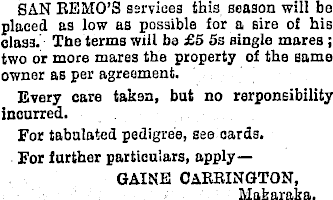 SAN EEMO’S services this season will bo placed as low as possible for a sire of his olass. The terms will be £5 5s single mares ; two or more mares the property of the same owner as per agreement. Every care taken, but no rorponsibility inourred. For tabulated pedigree, see cards. For further particulars, apply— GAINE CARRINGTON, Makaraka.