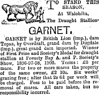 T '<o STAND THIS . SEASON, At Waiohika, The Draught Stallion' GARNET, GAIiNET is by British Dion (imp.), dam Topaz, by Overdraft, grand dam by Dugdale (imp.), great grand dam imported. Winner of First Prize and Sooiety’s Medal for draught stallion at Poverty Bay A. and P. Society’s Show, 1896-97-98, 1900. Terms: £3 per mare, for two or more mares the property of the same owner, £2 10s. Six weeks’ grazing free; after that 23 6d per week will, be charged. Fees to be paid before the removal of mares. All care taken, but no responsibility incurred.