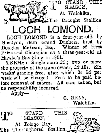 Pah LOCH rrtO STAND, THIS JL SEASON, At Waiohika, iThe Draught Stallion, LOMOND. LOCH LOMOND is'a four-year-old, by Glenlyon, dam Grand Duchess, bred by Douglas McLean, Esq. Winner of First Prize and Champion as a three-year-old at Hawke’s Bay Show in 1901. TERMS : Single mare £3; two or more the property of the same owaer, £2 10s. Six weeks’ grazing free, after which 2s 6d per week will be charged. Fees to be paid before removal of mares. All care taken, but no responsibility incurred. Apply— C. GRAY, Waiohika. TO STAND THIS SEASON, At Tolago Bay, The Thoroughbred Stallion