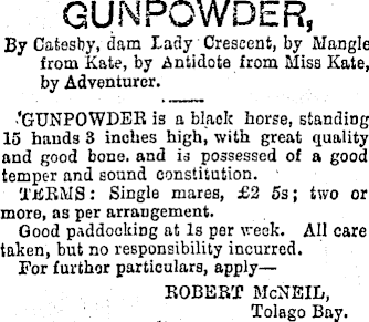 GUNPOWDER, By Catesby, dam lady Crescent, by Mangle from Kate, by Antidote from Miss Kate, by Adventurer. ‘GUNPOWDEB is a black horse, standing 15 hands 3 inches high, with great quality and good bone, and is possessed of a good temper and Eound constitution. 'i'BBMS: Single mares, £2 ss; two or more, as per arrangement. Good paddooking at Is per week. AH care taken, but no responsibility incurred. For further particulars, apply— BOBEBT McNEIB, Tolago Bay.