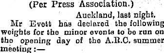 (Per Press Association.) Auckland, last night. Mr Evott has declared the following weights for the minor ovonta to bo run on the opening day of the A.R.C. summer meoting:—