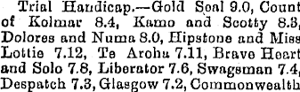 Trial Handicap.—Gold Soul 9.0, Count of Kolmar 8.4, Kamo and Scotty 8.3, Dolores and Numaß.o, Hipstono and Miss Lottie 7.12, Te Arohu 7.11, Brave Heart and Solo 7.8, Liberator 7.6, Swagsman 7 4, Despatch 7.3, Glasgow 7.2, Commonwealth