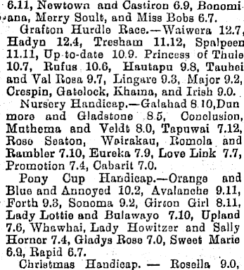 6.11, Newtown and Castiron 6.9, Bonomi ■ Jana, Merry Soulfc, and Miss Bobs 6.7. Grafton Hurdle Race.—Waiwera 12.7, Hadyn 12.4, Tresham 11.12, Spalpeen 11.11, Up to-date 10.9. Princess of Thule 10.7, Rufus 10.6, Hautapu 9.8, Taubei and Val Rosa 9.7, Lingaro 9.3, Major 9.2, Crespin, Gatolock, Kharna, and Irish 9.0. Nursory Handicap.—Galahad 8 10,Dun more and Gladstone 85, Conclusion, Muthoma and Veldt 8.0, Tapuwai 7.12, Rose Seaton, Wairakau, Bomola and Rambler 7.10, Eureka 7.9, Lore Link 7.7, Promotion 7.4, Cabarit 7.0. Pony Cup Handicap.—Orange and Blue and Annoyed 10.2, Avalanche 9.11, Porth 9.3, SoDoma 9.2, Girton Girl 8.11, Lady Lottie and Bulawayo 7.10, Upland 7.6, Whawhai, Lady Howitzer and Sally Horner 7.4, Gladys Rose 7.0, Sweet Marie 6.9, Rapid 6.7. Christmas Handioap. Rosella 9.0,