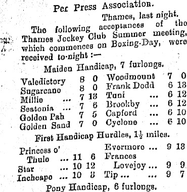 press Association. Thames, last night. Thn following acceptances of tho r which commences on Boxing-Day, were received to-night: Maiden Handicap, 7 furlongs. Va'edictory 8 0 7^0 Sugarcane 8 _ 6 12 Santonin !.'! 7 6 Brookby ... 6 12 Golden Pah 7 5 Capford ... 6 10 Golden Sand 7 0 Cyclone ... b 10 First Handicap Hurdles, U miles. Princess o’ o Evermore ... 9 13 Thule ... 11 6 Prances Star ... 10 12 Lovejoy... 9 9 Inchcapo ... 10 9 Tip 9 7 Pony Handicap, 6 furlongs.