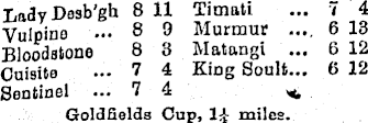 LadyDssb'gh 8 11 Timati 7 4 Vulpine ... Bloodstone 8 9 8 8 Murmur .... Matangi ... 6 6 13 12 Cuisite 7 4 King Soult... 6 12 Sentinel ... 7 4 Goldfields Cup, miles.