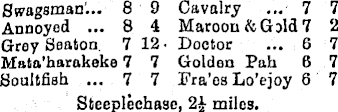 Swagsman... 8 9 Cavalry 7 7 AnDoyod ... 8 4 Maroou &Gdiq 7 2 Grey Seaton 7 12Doctor 6 7 Mata’harakeke 7 7 Golden Pah 6 7 Souitfish ... 7 7 Fra’os Lo’ejoy 6 7 Steeplechase, 2J miles.