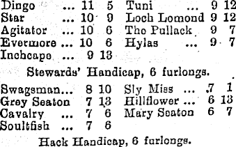Dingo 11 5 Tuni 9 12 Star 10 9 Loch Lomond 9 12 Agitator ... 10 6 Tho Pullack 9 7 Evermore ... 10 6 Hylas 9 7 Inohcapo ... 9 18 Stewards Handicap, 6 furlongs. Swagsman... 8 10 Sly Miss ... .7 1 Grey Seaton 7 13 Hillflowor ... 6 18 Cavalry 7 6 Mary Soaton 6 7 Soultfish ... 7 6 Hack Handicap, 6 furlongs.